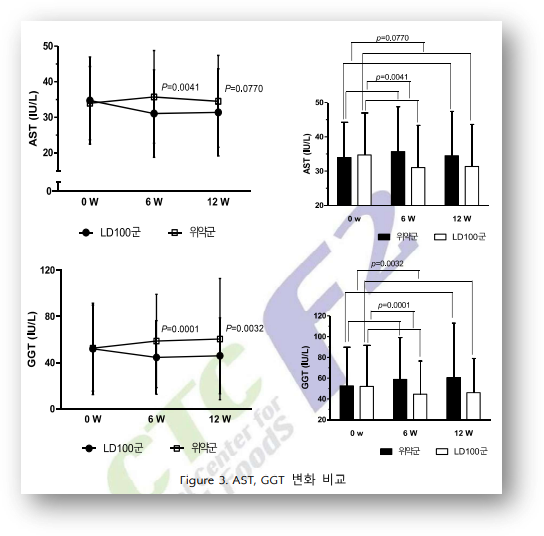 "본 인체적용시험을 통해 LD100 500 mg/day의 12주 섭취가 경증 간 기능 저하 대상자에서 혈중 AST, GGT를 감소시켜 간 기능을 개선시키는 기능이 있음을 확인하였다. 또한 연구가 진행되는 동안 임상적으로 의미 있는 이상반응이나 신체변화가 관찰되지 않아 LD100의 섭취는 인체에 안전하다고 판단하였다."