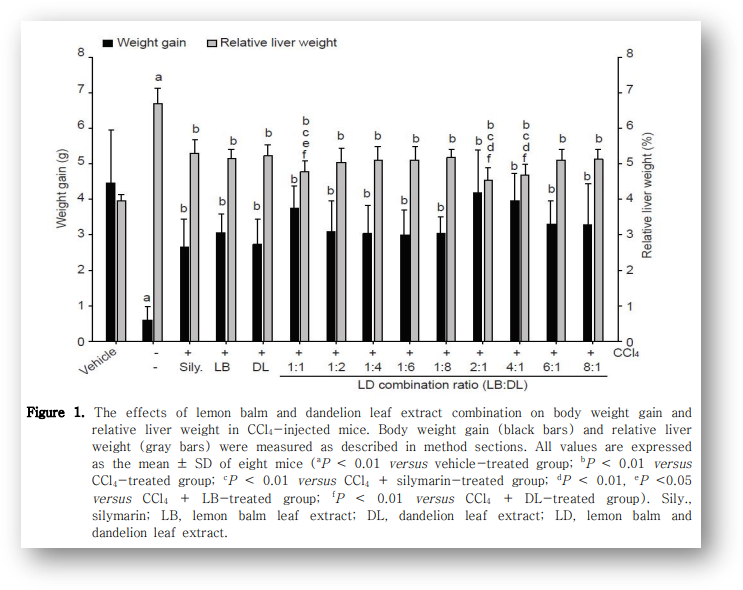 "혼합 비율의 레몬밤과 민들레 잎 추출물의 투여는 간 독성에 의한 간 상대중량의 증가를 통계적으로 유의하게 억제했으며, … 밀크씨슬추출물(실리마린), 레몬밤 단독, 민들레 단독 투여 그룹보다 간 상대중량을 더욱 감소시켰다."