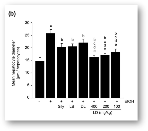 이 때문에 간 건강 기능성 원료의 효능에 있어 중요하게 검토되는 항목 중 하나가 알코올에 의한 간 손상 억제의 효과성이기도 합니다. 2020년, SCI급 국제학술지 Journal of Food Biochemistry에서는 알코올성 간 손상에 대한 레몬밤민들레추출복합물(LD100)의 보호 효과가 확인되었으며 효과성의 차원에서 밀크씨슬 추출물보다 우수했음을 발표하고 있습니다.