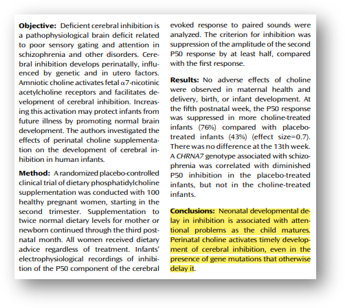 "태아 및 신생아의 뇌 발달 지연은 아이가 성장함에 따라 주의력 문제와 관련된다. 임신 20주부터 출산 이후까지의 주산기에 산모의 포스파티딜콜린 섭취는 태아 대뇌의 정상발달을 활성화하며 이는 뇌 발달을 지연시키는 유전적 요인이 있을 경우에도 동일하게 나타났다."