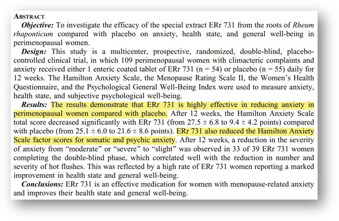 "결과는 루바브뿌리추출물(ERr 731)이 폐경기 여성의 불안을 줄이는 데 매우 효과적이라는 것을 보여준다. … 또한, 루바브뿌리추출물(ERr 731)은 신체적 및 정신적 불안에 대한 해밀턴 불안 척도 인자 점수를 감소시켰다."