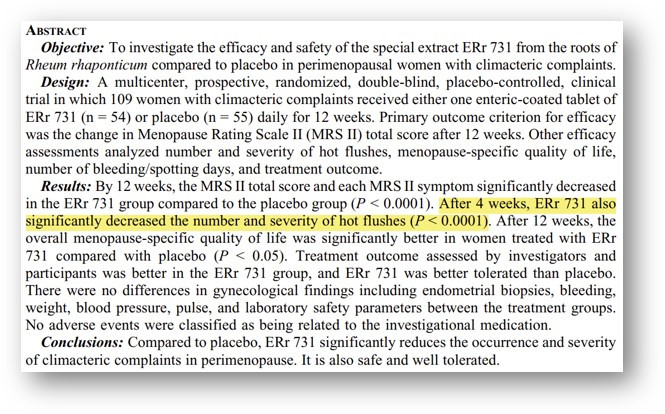 "4주 후, 루바브뿌리추출물(ERr 731)은 안면 홍조의 횟수와 정도를 유의하게 감소시켰다."