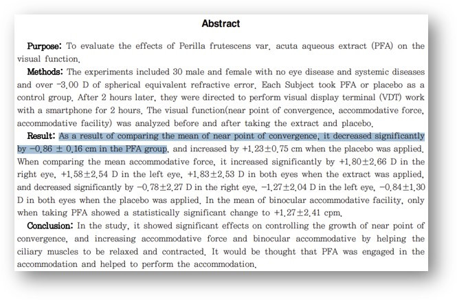 참고 문헌 : Kim, J., Choi, H., Kim, M., Oh, D., Kim, Y., Kang, H., Jeong, K., Ryu, G., Pan, S., & Choi, C. (2017). Amelioration of Visual Display Terminal-induced Ocular Fatigue by Aqueous Extracts of Perilla frutescens var. acuta. Journal of Food and Nutrition Research, 5, 553-561.