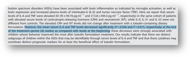 참고 문헌 : Tsilioni, I., Taliou, A., Francis, K. et al. (2015) Children with autism spectrum disorders, who improved with a luteolin-containing dietary formulation, show reduced serum levels of TNF and IL-6. Transl Psychiatry 5, e647.