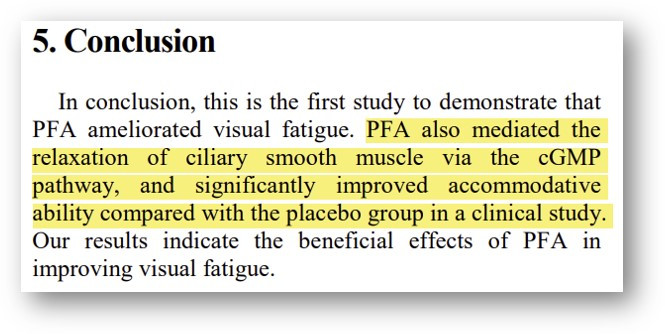 "PFA(차즈기추출물)는 또한 cGMP 경로를 통해 섬모 평활근의 이완을 매개했으며, 임상 연구에서 위약군에 비해 양안 조절 능력이 크게 향상되었다."