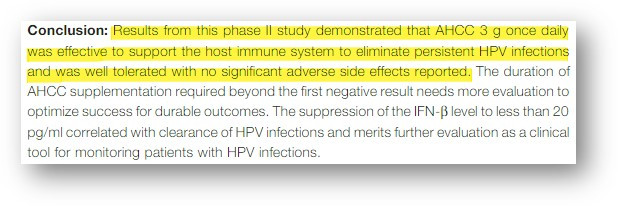 "AHCC(3g/day)의 보충이 HPV 감염을 제거하기 위한 숙주 면역 체계를 지원하는 데 효과적이며 심각한 부작용 없이 내약성이 우수함을 보여주었다."