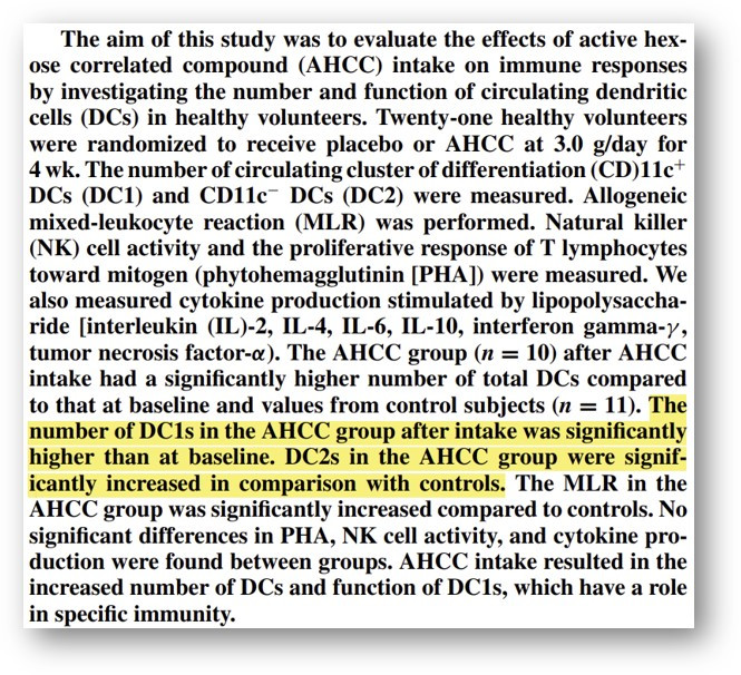 "AHCC 섭취는 특정 면역에 역할을 하는 수지상세포의 기능을 증가시키는 결과를 낳았다. 수지상세포는 대조군에 비해 AHCC 섭취 군에서 크게 증가했다."