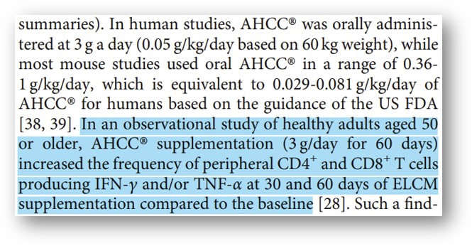 "50세 이상의 건강한 성인에 대한 관찰 연구에서, AHCC®(3g/day)의 보충은 IFN-γ 및/또는 TNF-α를 생성하는 말초 CD4+ 및 CD8+ T 세포의 빈도를 증가시켰다."