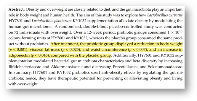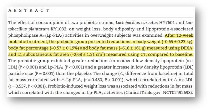 "12주간의 프로바이오틱스 치료 후, 체중, 체지방률, 체지방량의 감소를 나타냈다."
