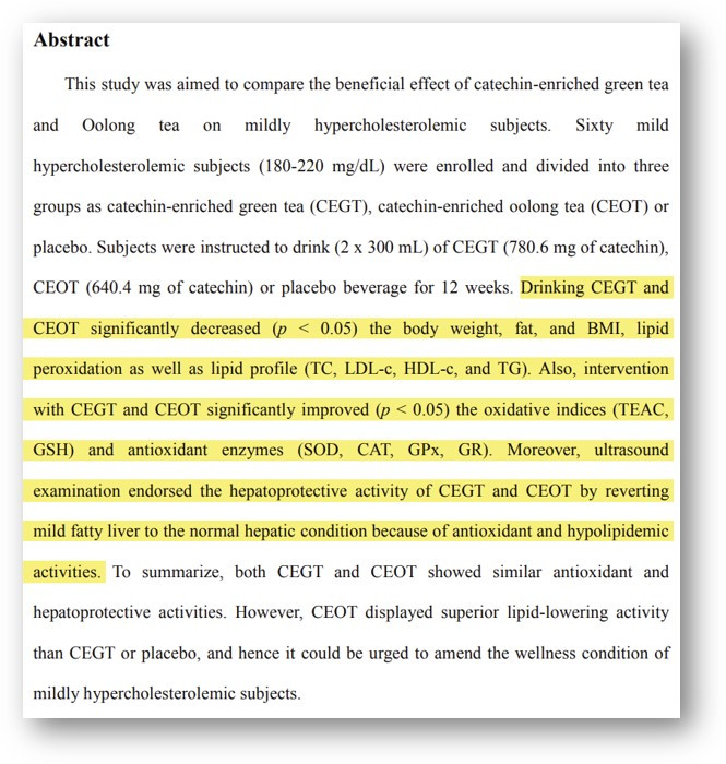 "CEGT(카테킨 강화 녹차)와 CEOT(카테킨 강화 우롱차)를 마시는 것은 체중, 지방, BMI, 지질 과산화 및 지질 프로필(총 콜레스테롤, LDL 콜레스테롤, HDL 콜레스테롤 및 중성지방)을 유의하게 감소시켰다. 또한, CEGT 및 CEOT의 개입은 산화 지수(TEAC 및 GSH)와 항산화 효소(SOD, CAT, GPx 및 GR)를 크게 개선했다. 또한, 초음파 검사는 항산화 및 지질 저하 활동으로 인해 가벼운 지방간을 정상 간 상태로 되돌림으로써 CEGT 및 CEOT의 간 보호 활동을 뒷받침했다."