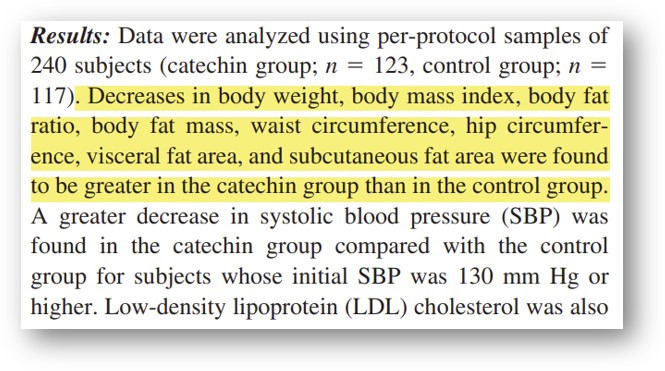 "체중, 체질량지수, 체지방비, 체지방량, 허리둘레, 엉덩이둘레, 내장지방면적, 피하지방면적의 감소는 대조군보다 카테킨 섭취군에서 더 큰 것으로 나타났다."
