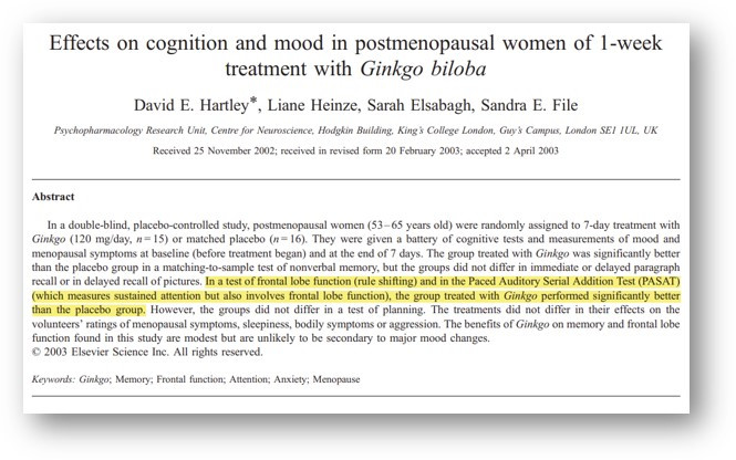 참고 문헌 : Hartley, D. E., Heinze, L., Elsabagh, S., & File, S. E. (2003). Effects on cognition and mood in postmenopausal women of 1-week treatment with Ginkgo biloba. Pharmacology, biochemistry, and behavior, 75(3), 711–720.