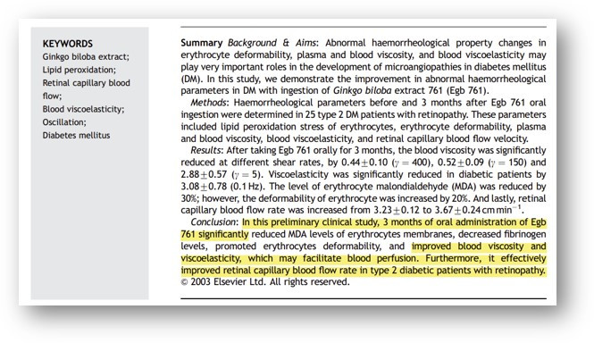 참고 문헌 : Huang, S. Y., Jeng, C., Kao, S. C., Yu, J. J., & Liu, D. Z. (2004). Improved haemorrheological properties by Ginkgo biloba extract (Egb 761) in type 2 diabetes mellitus complicated with retinopathy. Clinical nutrition (Edinburgh, Scotland), 23(4), 615–621.