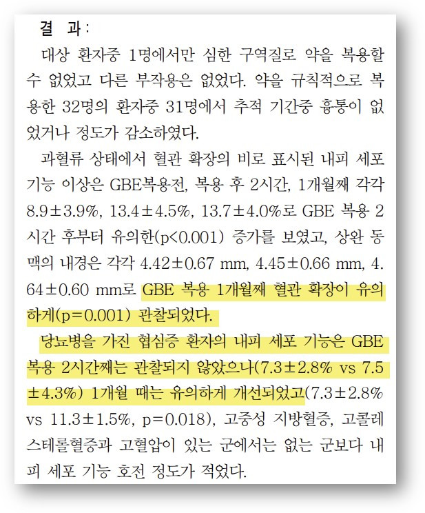 "복용 1개월째 혈관 확장이 유의하게 관찰되었다. (중략) 당뇨병을 가진 협심증 환자의 내피 세포 기능은 GBE(은행잎추출물) 복용 2시간째는 관찰되지 않았으나 1개월 때는 유의하게 개선되었다."