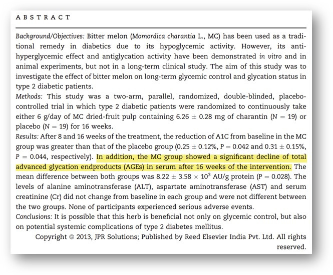 Trakoon-osot, W., Sotanaphun, U., Phanachet, P., Porasuphatana, S., Udomsubpayakul, U., & Komindr, S. (2013). Pilot study: Hypoglycemic and antiglycation activities of bitter melon (Momordica charantia L.) in type 2 diabetic patients. Journal of Pharmacy Research, 6(8), 859-864. ISSN 0974-6943.