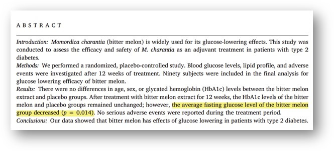 Kim, S. K., Jung, J., Jung, J. H., Yoon, N., Kang, S. S., Roh, G. S., & Hahm, J. R. (2020). Hypoglycemic efficacy and safety of Momordica charantia (bitter melon) in patients with type 2 diabetes mellitus. Complementary therapies in medicine, 52, 102524.