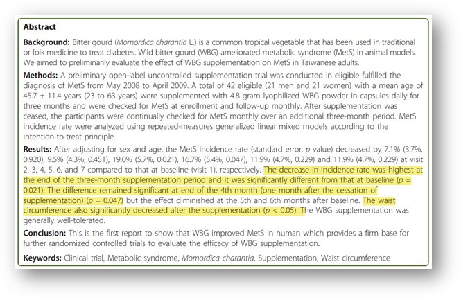 2012년에는 대만의 연구진이 여주의 섭취가 대사증후군을 개선할 수 있는지 알아보기 위해, 대사증후군 기준 중 3-5가지에 해당하는 성인 42명을 대상으로 인체적용시험을 진행했는데요.