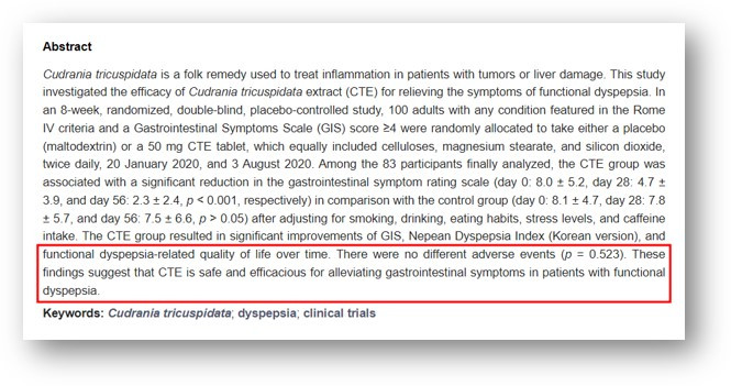 "특별한 부작용은 없었다. 이러한 결과는 꾸지뽕잎추출물(CTE)이 기능성 소화불량 환자의 위장 증상 완화에 안전하고 효과적이라는 것을 시사한다."