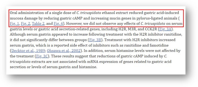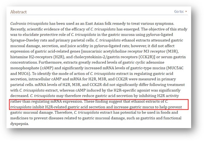 "이러한 결과는 꾸지뽕잎추출물이 H2R(H2 히스타민 수용체) 관련 위산 분비를 억제한다는 것을 시사한다."
