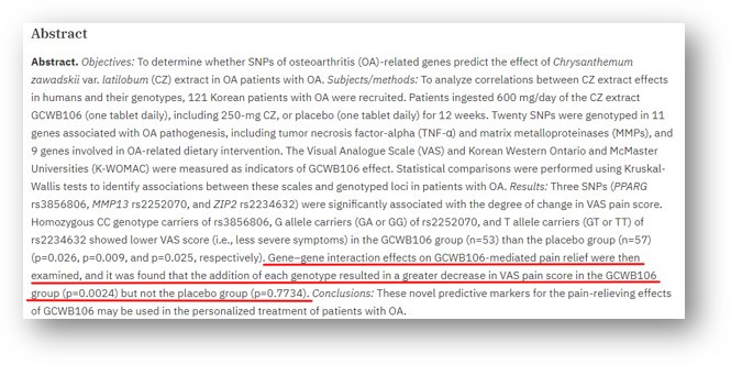 "GCWB106(구절초추출물)은 초기 관절염 환자에서 통증을 줄이고 신체 기능, 삶의 질 및 관절 건강을 개선하는 더 좋은 능력을 가졌다는 것을 입증합니다."