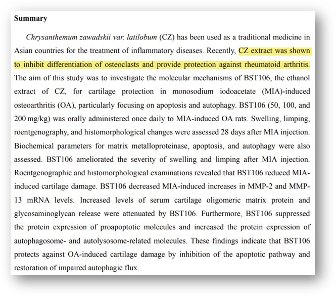 참고 문헌 : Osteoarthritis improvement effect of Chrysanthemum zawadskii var. latilobum extract in relation to genotype. Taeheon Lee, Chae-Bin Na, Dasom Kim, Hae Jung Han, Jongbok Yun, Sun Kyu Park, and Eunhae Cho. International Journal for Vitamin and Nutrition Research 0 0:0.