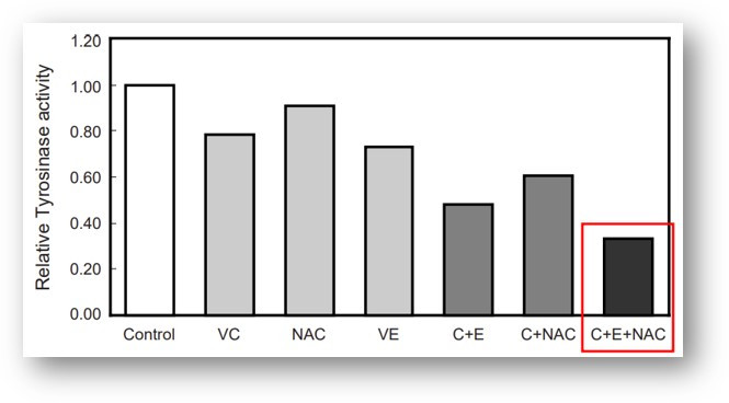"B16세포에서의 비타민C, 비타민E, N-아세틸 시스테인 동시 치료는 멜라닌 함량을 줄이고 티로시나아제 활성을 억제하는 데 가장 효과적이었다."