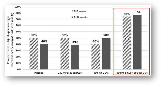 참고 문헌 : Duperray, Joël, Sergheraert, Renaud; Chalothorn, Kunyanatt; Tachalerdmanee, Preeyanuch; Perin, Fabrice (2021). The effects of the oral supplementation of L-Cystine associated with reduced L-Glutathione-GSH on human skin pigmentation: a randomized, double-blinded, benchmark- and placebo-controlled clinical trial. Journal of Cosmetic Dermatology, 1-12.