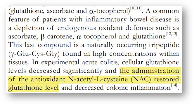 참고 문헌 : Guijarro, L. G., Mate, J., Gisbert, J. P., Perez-Calle, J. L., Marín-Jimenez, I., Arriaza, E., Olleros, T., Delgado, M., Castillejo, M. S., Prieto-Merino, D., Lara, V. G., & Peña, A. S. (2008). N-acetyl-L-cysteine combined with mesalamine in the treatment of ulcerative colitis: Randomized, placebo-controlled pilot study. World Journal of Gastroenterology, 14(18), 2851.