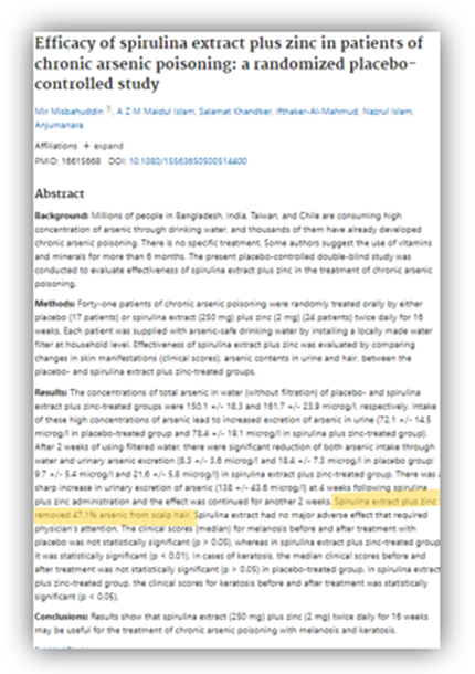 참고문헌 : Misbahuddin, M., Maidul Islam, A. Z. M., Khandker, S., Ifthaker-Al-Mahmud, Islam, N., & Anjumanara. (2006). Efficacy of spirulina extract plus zinc in patients of chronic arsenic poisoning: a randomized placebo-controlled study. Clinical Toxicology, 44(2), 135-141.