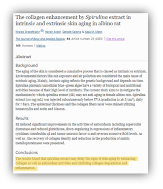 참고문헌 : Sharafeldein, K., Ayesh, H., Salama, S., & Marei, A. M. (2023). The collagen enhancement by Spirulina extract in intrinsic and extrinsic skin aging in albino rat. The Journal of Basic and Applied Zoology, 84(1), 25.