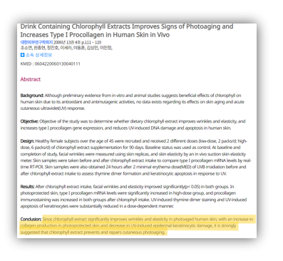 참고문헌 : 조소연, 원종현, 정진호, 이세라, 이동훈, 김상민, & 이민정. (2006). Drink containing chlorophyll extracts improves signs of photoaging and increases type I procollagen in human skin in vivo. 대한피부연구학회지, 13(4), 111-119.