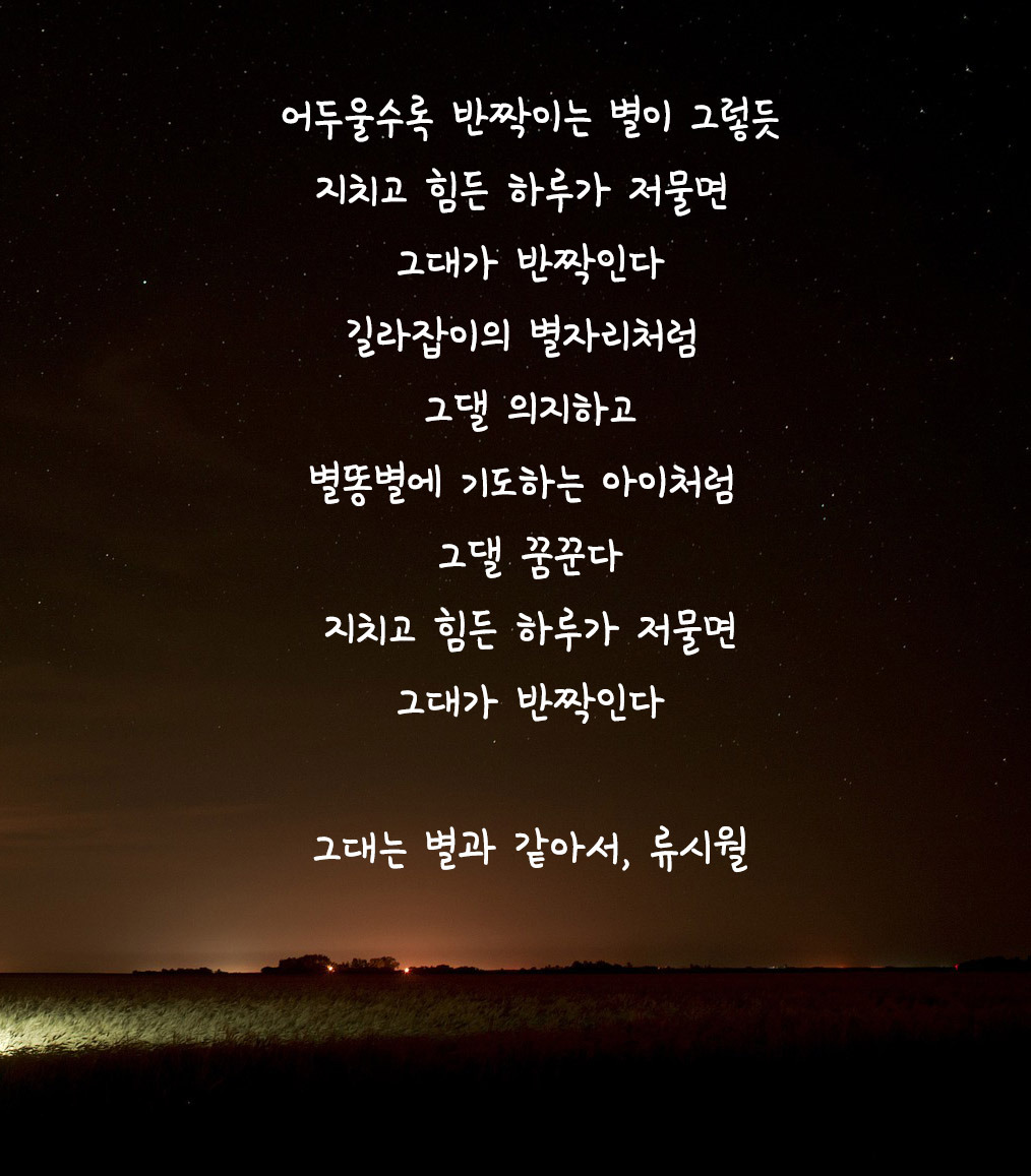 그대여. 나 역시 그대에게 별처럼 뜬 사람이면 좋겠습니다. 햇살이 비추는 시간, 모든 것들이 보이는 낮에는 초라한 제 빛이 비록 보이지 않을지도 모르겠습니다. 다만 그대 역시 저와 같은 어둠을 맞이했을 때, 그대를 향해 반짝이는 저를 보며 나아갈 수 있었으면 좋겠습니다. 그대가 제게 그랬던 것처럼 저 역시 두려운 그대의 밤하늘에 뜬 별이 되려 합니다.