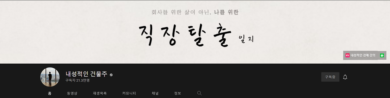 우연히 재테크 공부를 하다가, 보게 된 채널. 부동산에 관련된 컨텐츠와 부자가 되기 위해 평범한 직장인이 어떻게 변해가는지 잘 알려준다. 정말 좋은 영상들이 있어서 가볍게 보기 좋다.