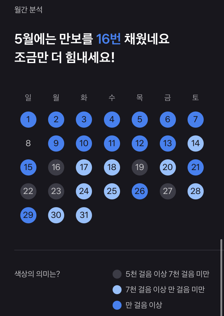 지난달부터 매일 꾸준히 걷기를 실천하고 있다. 의식적으로 걸으려고 하며 걷기가 주는 효과를 최대한 누리려고 했다. 저번에 말했듯이 걷기는 정말 많은 장점들이 있어서 꼭 추천해주고 싶다. 6월에는 매일 만보를 더 많이 걸으려고 노력해야겠다!!