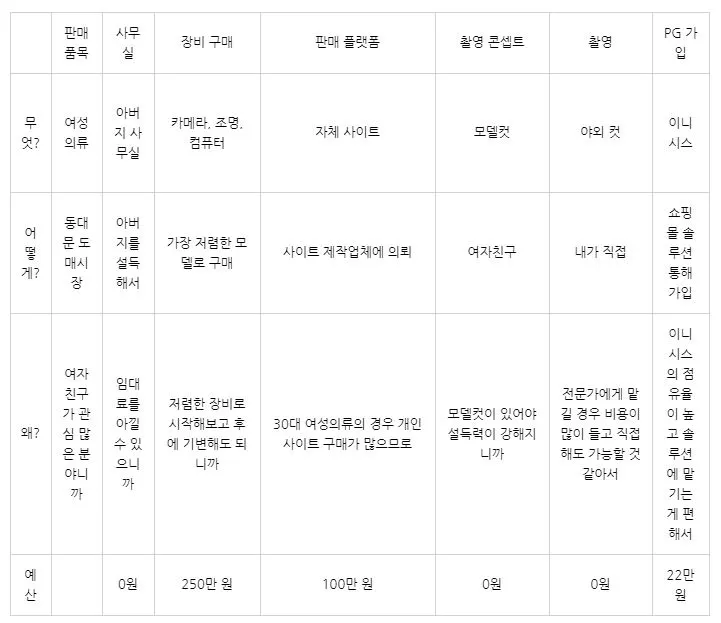 사업 기획이 뭔가 대단한 것 같지만, 사실 별거 아니다. 그냥 사업에 필요한 것들이 무엇인지, 준비해야 될 것들은 무엇인지, 어떤 방식으로 운영할지, 예산은 얼마나 들어갈지 등을 위 사례처럼 하나씩 체크하고 결정하는 것이다.