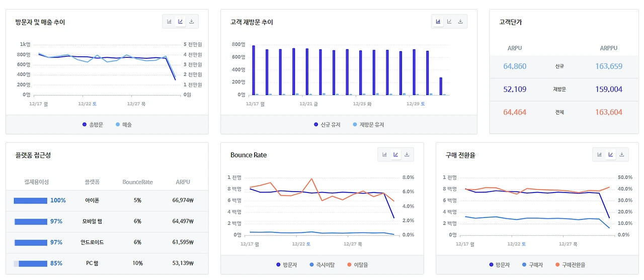 방문자 대비 매출은 해당 쇼핑몰의 경쟁력을 의미하기 때문에 방문자와 매출의 갭이 커지지 않도록 유심히 체크해야 한다.