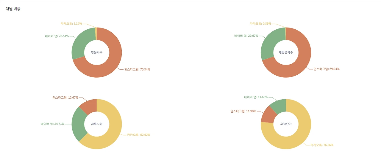 대부분의 방문자가 인스타를 통해 유입되고 있지만 체류시간이나 고객 단가는 다른 채널에 비해 압도적으로 낮다.