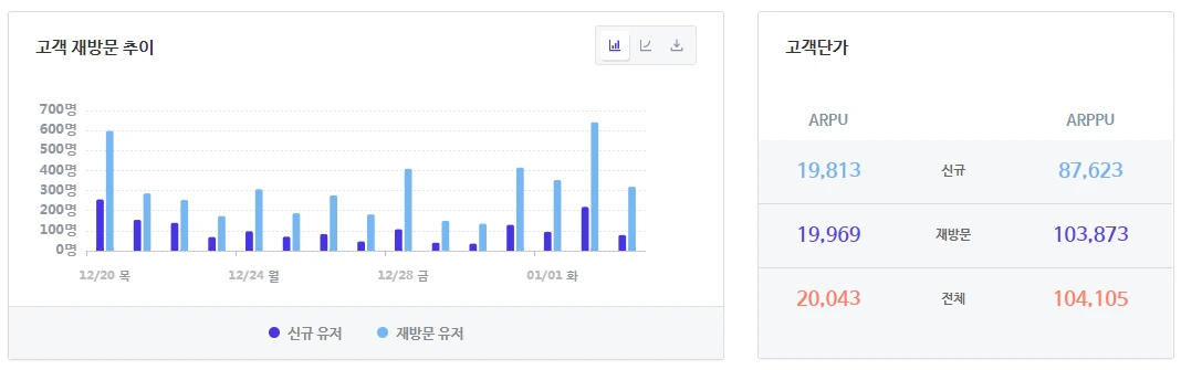 재방문율이 높다는 건 신규로 확보한 고객들이 쉽게 이탈되지 않는다는 걸 의미한다. 신규 고객을 확보하기 위해 많은 비용이 발생하는 걸 감안하면 얼마나 중요한 지표인지 이해될 것이다.