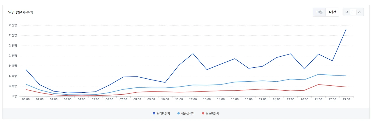 상단의 차트는 시간대별 방문자를 나타낸 것이고 하단의 차트는 시간대별 구매자를 나타낸 것이다.