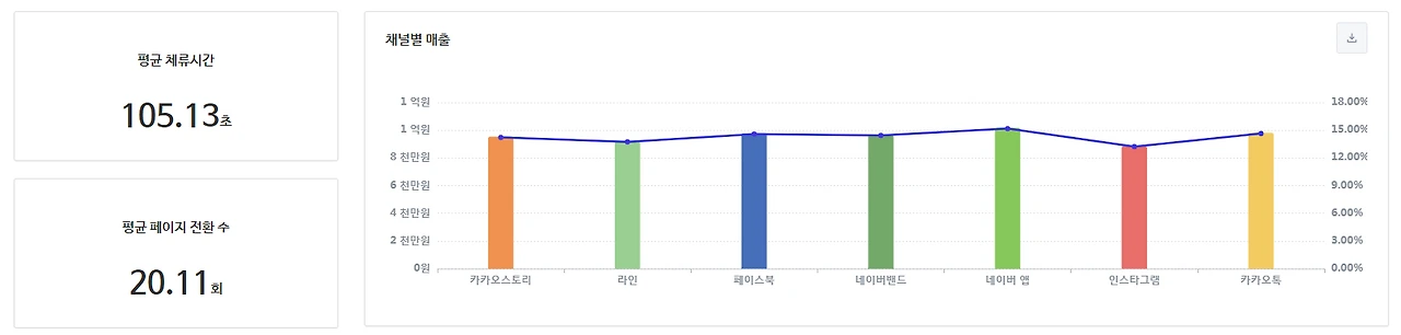 방문자가 평균적으로 살펴보는 페이지 수다. 위 차트처럼 평균 20회를 기록하는 경우는 극단적으로 컨디션이 좋은 쇼핑몰에서나 기록할 수 있는 수치고, 평범한 경우 3~4회 정도를 기록한다.
