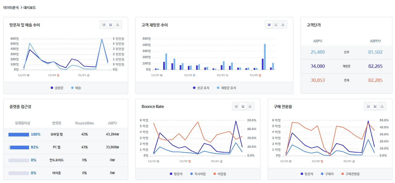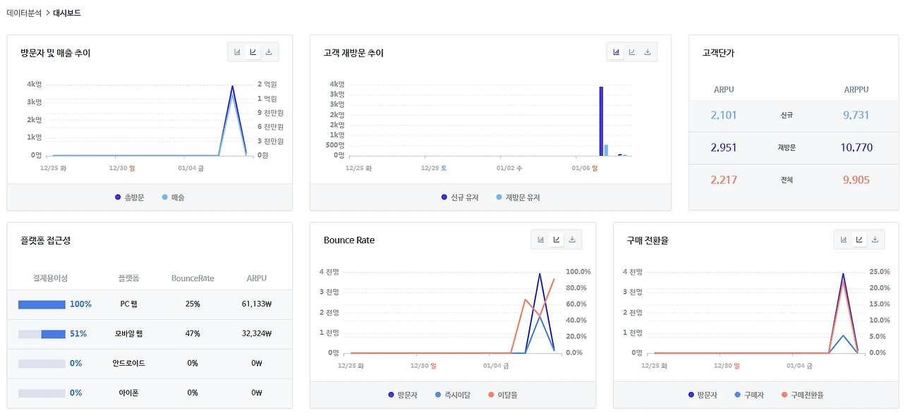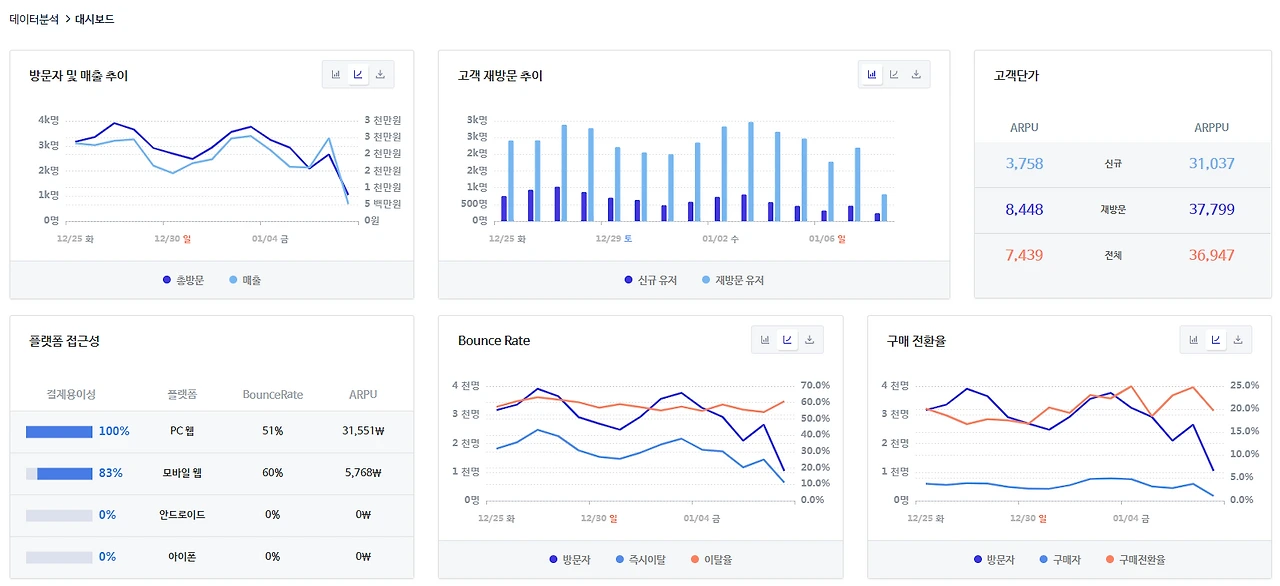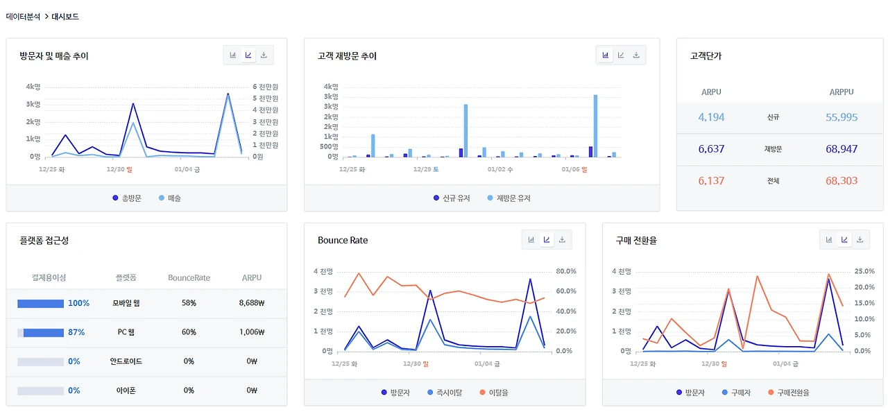 구매 전환율이 20% 전후를 기록하고 있고 재방문자 비율도 높은 것으로 보아 충성고객을 상당 수 확보한 것으로 보인다.