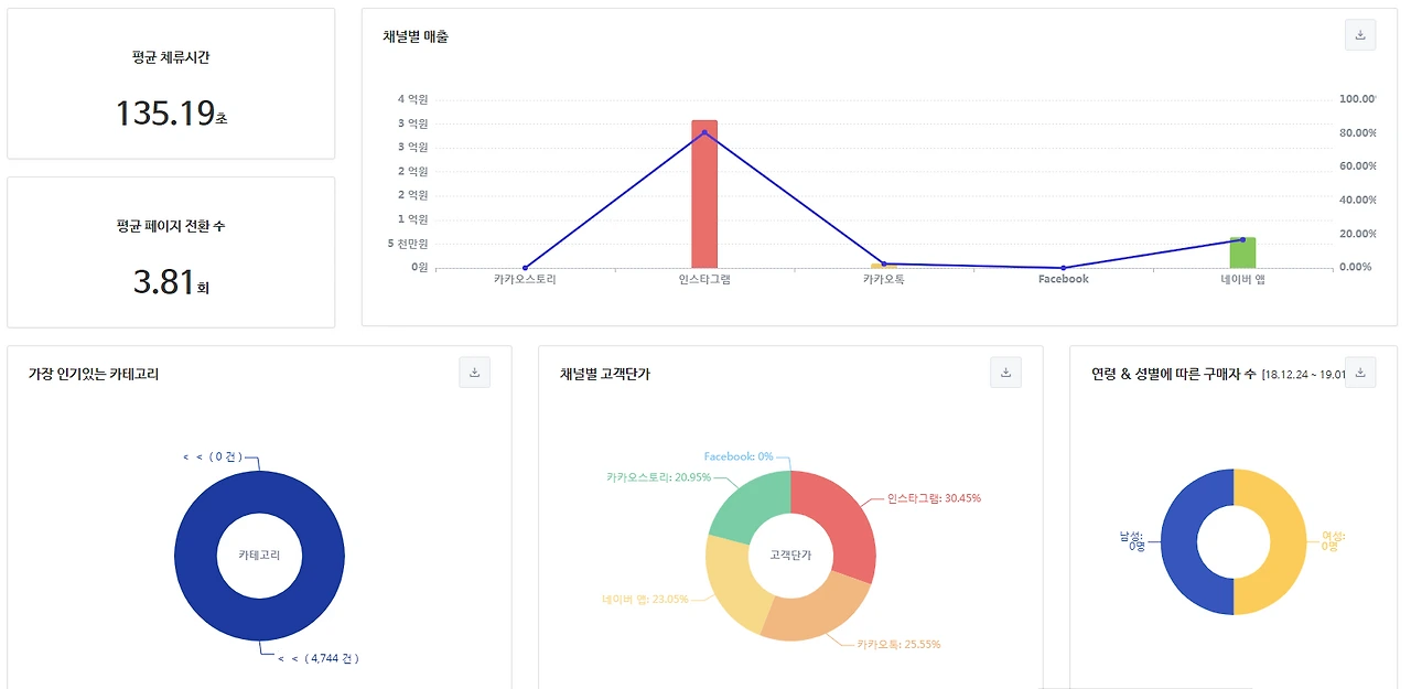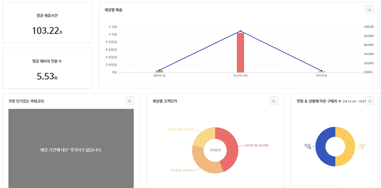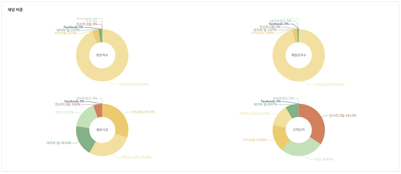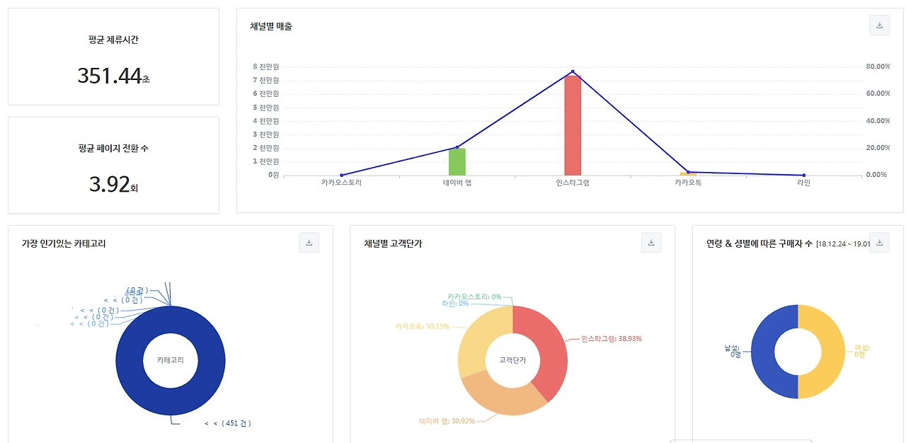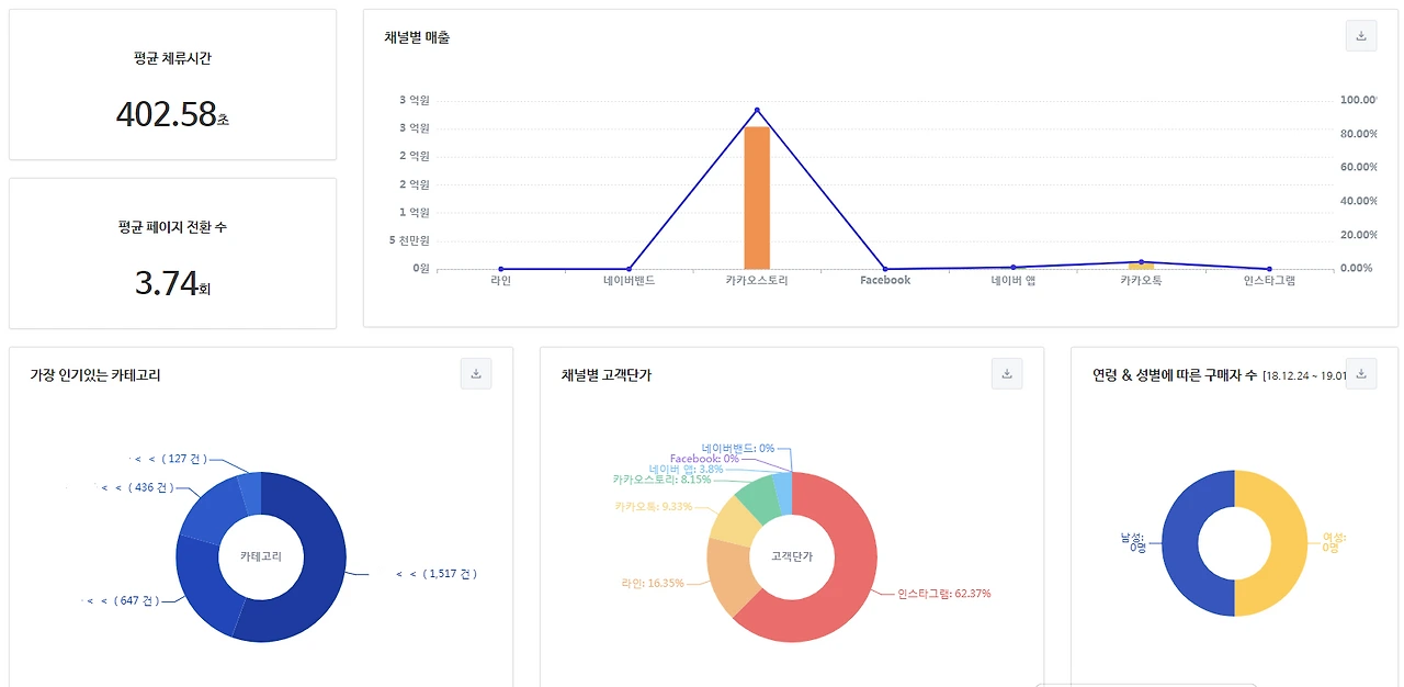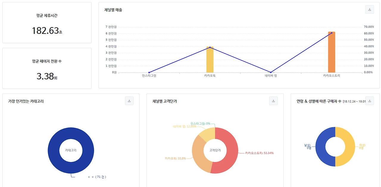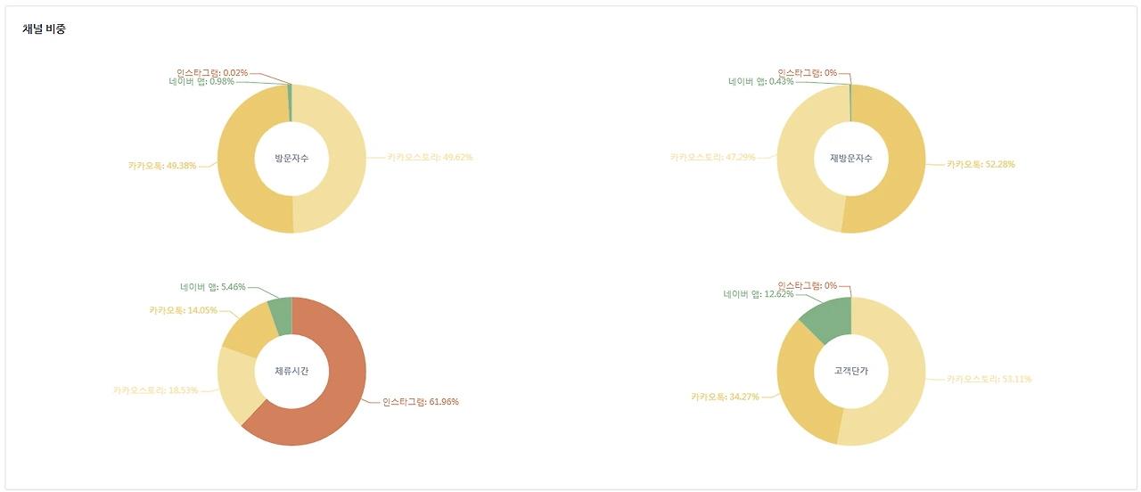 이 쇼핑몰의 문제점은 재방문자 비율이 압도적인데도 즉시 이탈률이 너무 높다는 것이다. 그리고 유입자가 제일 적은 인스타그램의 체류시간이 제일 길다는 것이다. 인스타그램 유입자가 워낙 적어 100% 신뢰할 순 없겠지만 카카오톡에만 의존한 지금보다 나아질 가능성이 있으므로 인스타그램을 통한 방문자 유입을 적극 고려할 필요가 있다.