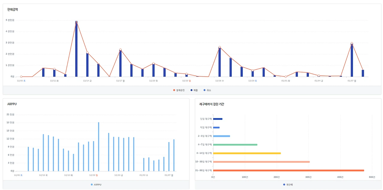 상품 종류가 많고 어느 하나에 편중되지 않고 골고루 판매되고 있으며 재구매까지 기간도 나쁘지 않은 것으로 보아 구매 단가만 끌어올리면 될 것 같다.