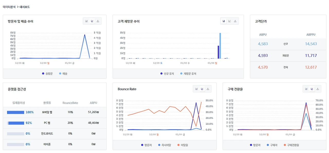 일간 매출 편차도 매우 크고 불안해서 구매 전환율을 빼면 매우 평범해 보인다.