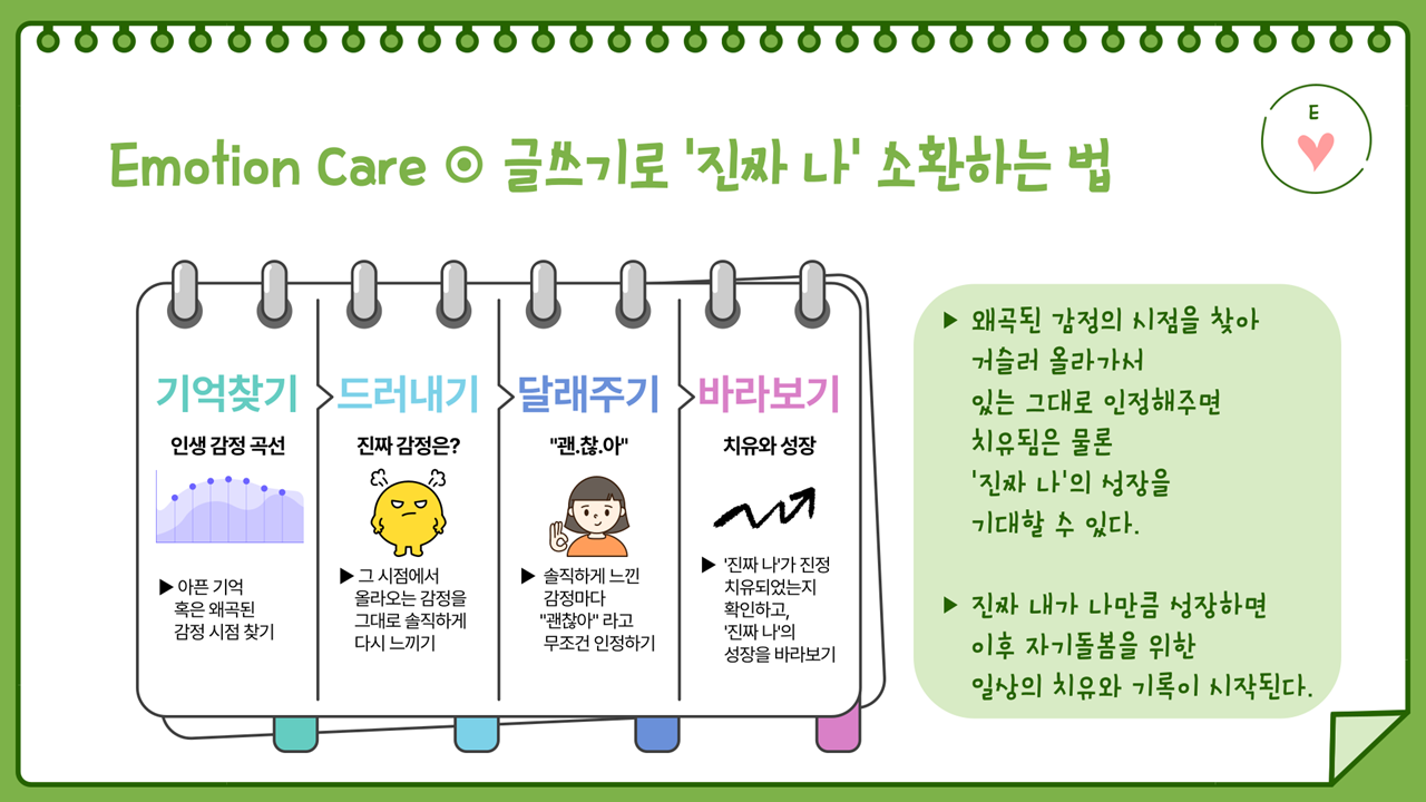 바로 자기돌봄 TREAT에서 말하는 E(감정 관리)는 결국, 이미 드러난 감정에 대한 후속 조치라 할 수 있다.