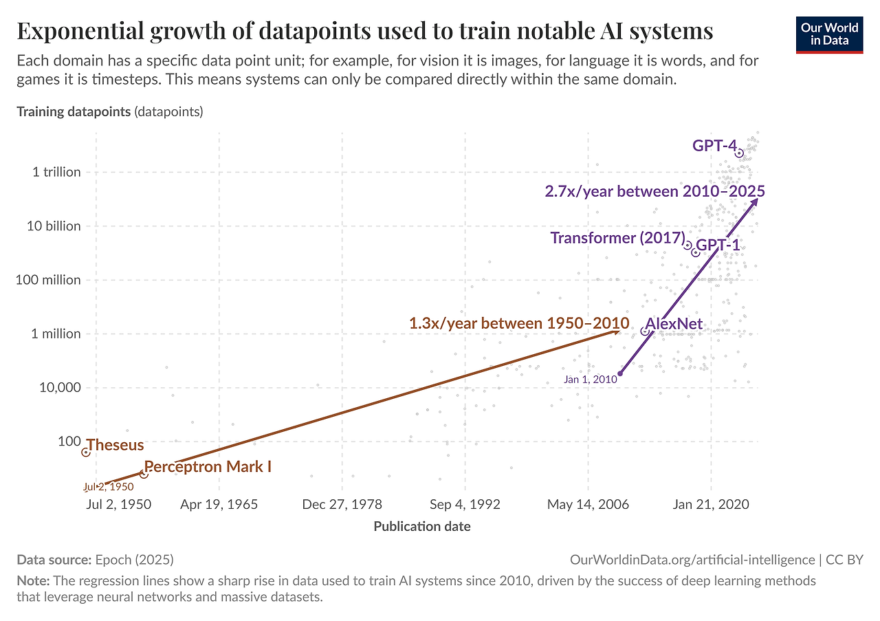 **학습 데이터 고갈: AI 모델이 훈련에 필요한 고품질 데이터가 인터넷상에서 점차 소진되고 있는 현상을 의미합니다. 연구기관 Epoch AI에 따르면 현재의 AI 개발 추세가 계속될 경우 2026년쯤, 인터넷상에 더 이상 학습할 텍스트 데이터가 없을 것으로 예상되고 있습니다.[5]