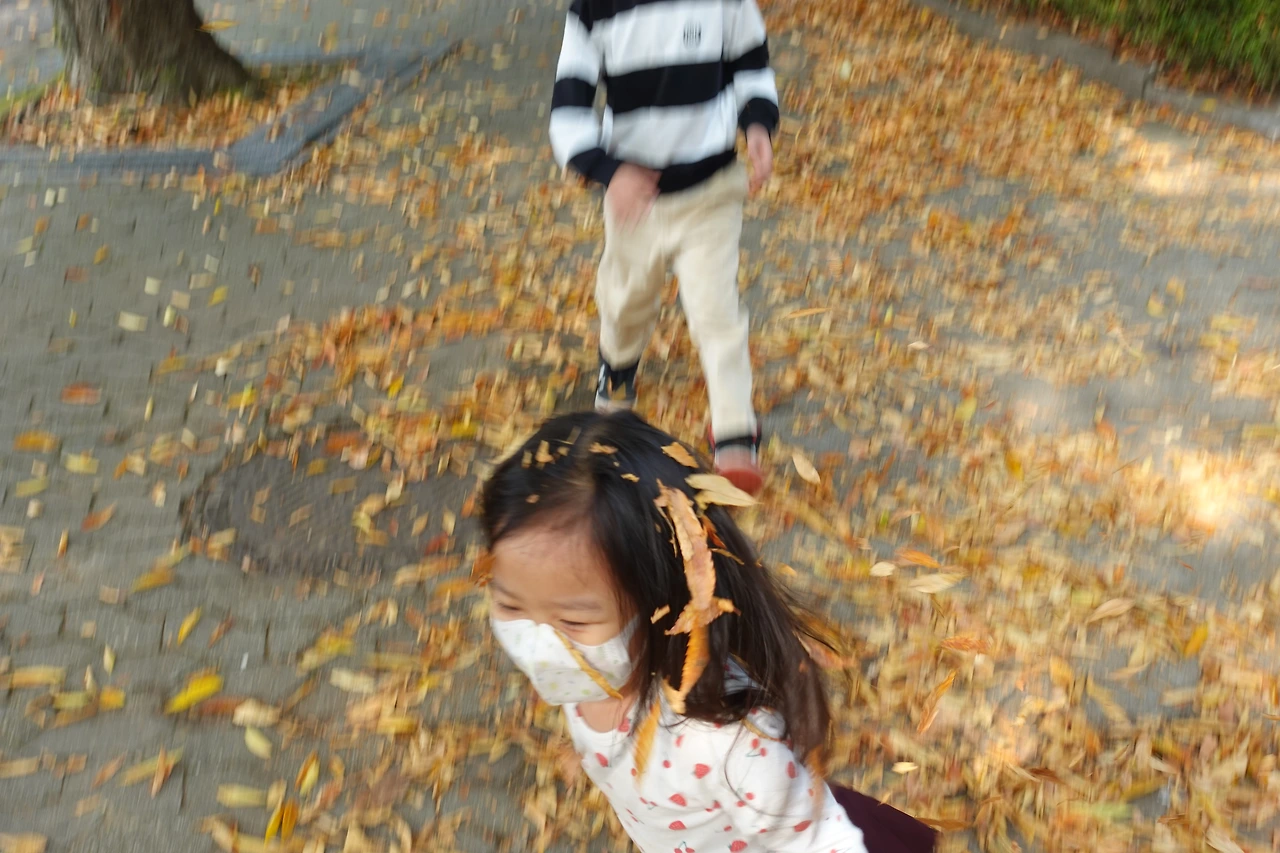 뭐가 그리 신기한지 우리 집 앞 화단에도 있는 나뭇잎을 주워 주머니에 쑤셔 넣어요.