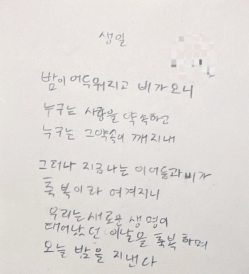 생일 아침에 아들이 고심하며 조심스럽게 내민 "개발새발" 글씨의 시구에 할 말을 잃었다