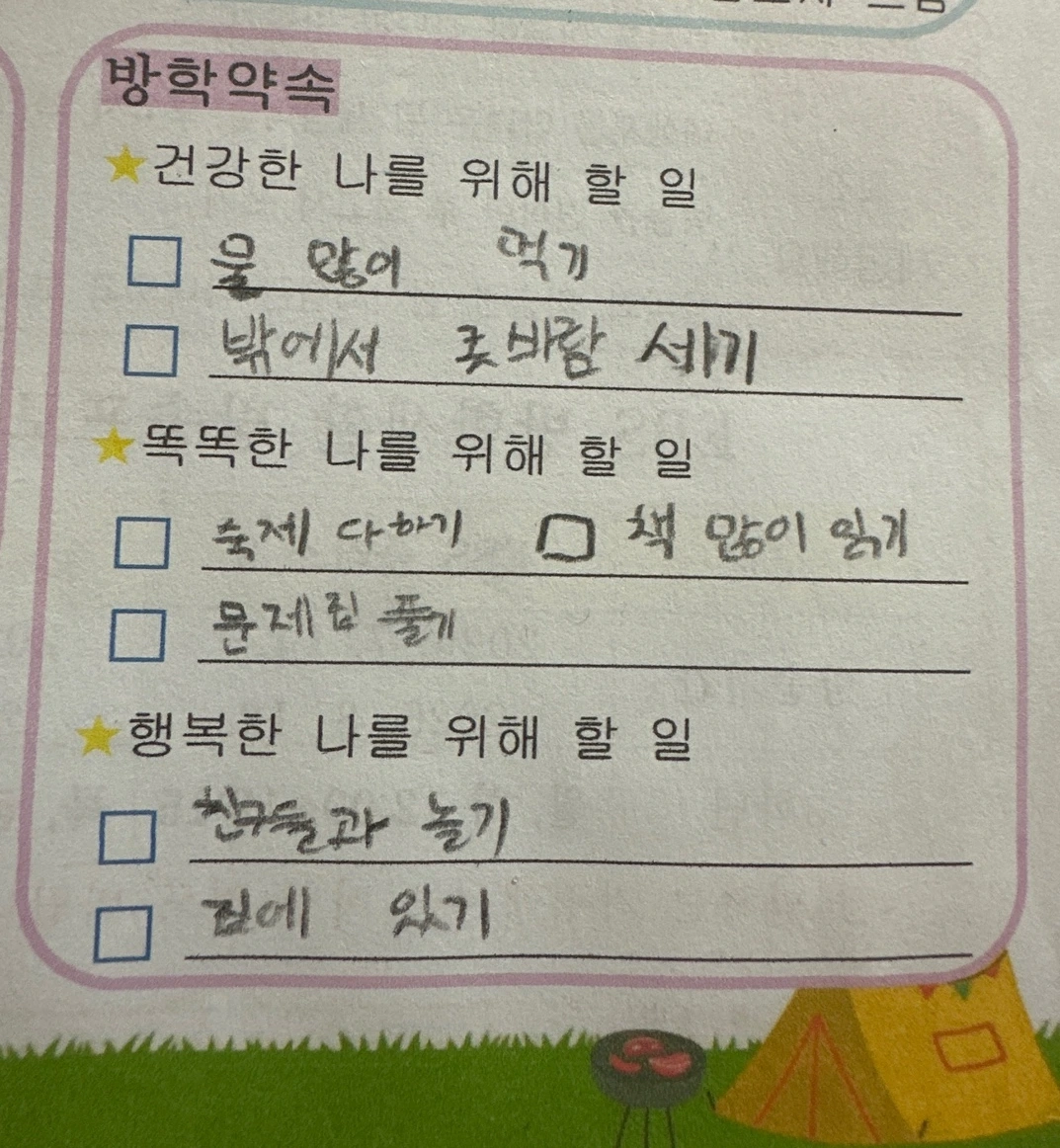 아이가 학교에서 써온 "행복한 나를 위한 여름방학 계획"에 코웃음이 났다