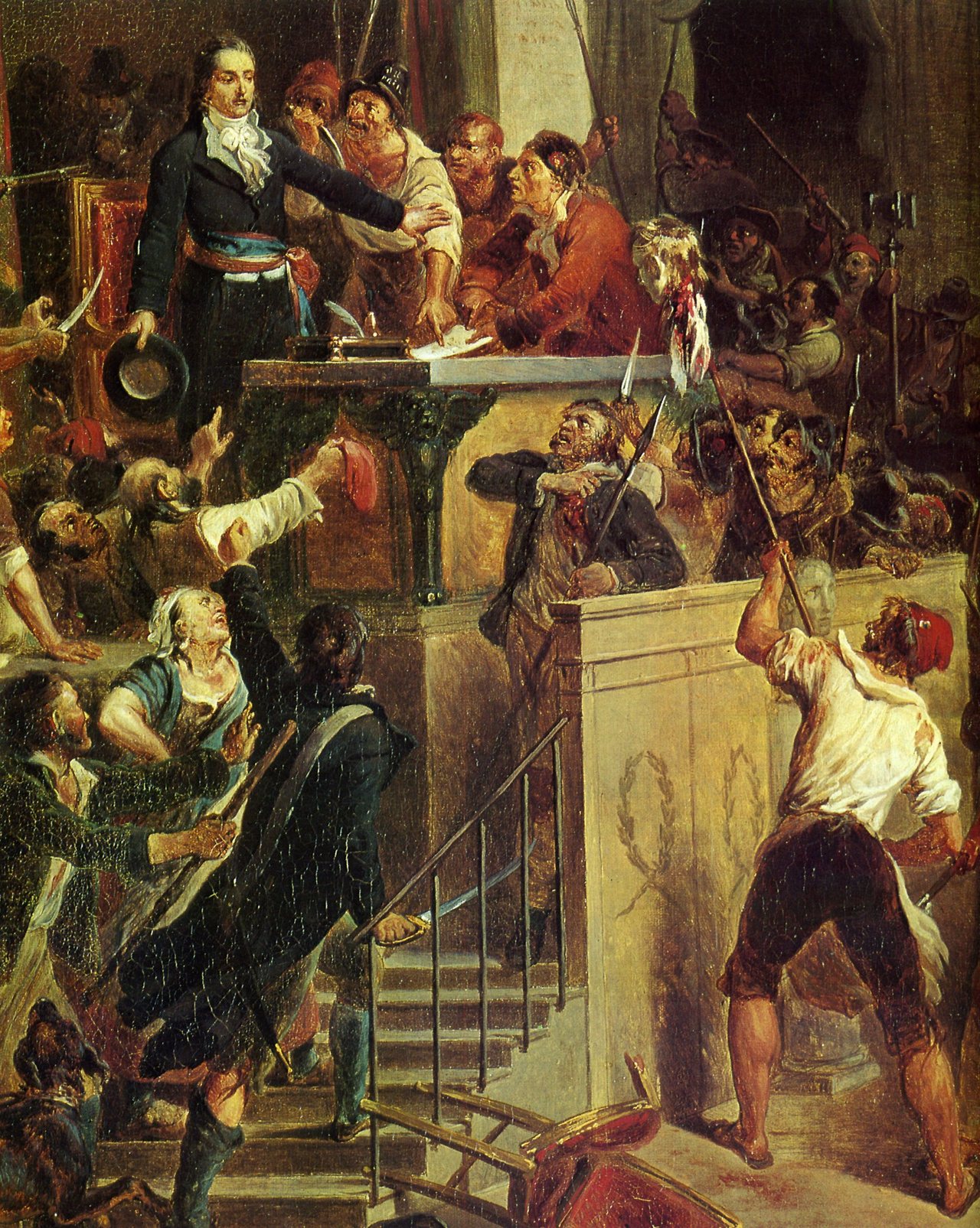 자코뱅 파는 토지 무상 분배를 통한 하층 시민들의 힘을 모아 공화제를 수립하려고 했어. 혁명재판소나 공안 위원회 같은 기관에서 매일 심사가 열렸고 기요틴이라 불리는 단두대 아래엔 발목까지 피가 차 올랐지. 그들은 근면하고 성실하게 반대파의 목을 잘랐어. 그간 정당하지 못했던 것들에 대한 울분이, 억눌렸던 것들에 대한 파괴적 복수가 광범위하게 분출했단다. 그리고 이때 자코뱅파의 지도자였던 장 폴 마라의 암살이 있었구나.